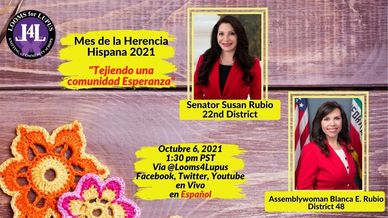 Acompañenos el Miércoles 6 de Octubre de 2021 a las 1:30pm en vivo via la pagina de Looms4Lupus en Facebook, Twitter, y, Youtube. Continuamos la Serie "Tejiendo una Comunidad de Esperanza" dedicada a celebrar Mes de La Hispanidad cual sera transmitida en Español! Nos da mucho orgullo de tener la oportunidad de iluminar y celebrar a dos mujeres lideres hispanas. Ambas representan a nuestra comunidad y son las primeras hermanas en ser elegidas el el Capitolio estatal, ellas son la Assemblywoman Blanca E. Rubio del Distrito 48 y Senadora Estatal Senator Susan Rubio del Distrito 22. Nos vemos!