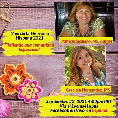 Acompañenos Miércoles 22 de Septiembre de 2021 a las 4:00pm en vivo via la pagina de Facebook de @Looms4Lupus. continuamos la Serie "Tejiendo una Comunidad de Esperanza" dedicada a celebrar Mes de La Hispanidad cual sera transmitida en Español! Estamos muy orgullosos de tener la oportunidad de celebrar a dos mujeres Hispanas\Latinas sus logros y contribuciones a nuestras comunidades. Nuestras invitadas son: Patricia Sicilano originaria de Guadalajara, Jalisco, Mexico. Obtuvo su maestría en Gerencia de Administración de la Universidad de Azusa Pacific. Patricia empezó a escribir cortas novelas y poemas de muy joven. Muchos de sus poemas y cortas historias fueron publicados en un periódico de Los Ángeles. Ahora Patricia es autora de 5 libros publicados; ¿De qué lado está la frontera?, Panda, Promesa, Corazón de Madre y Mi Ángel, que esta en ingles y español.