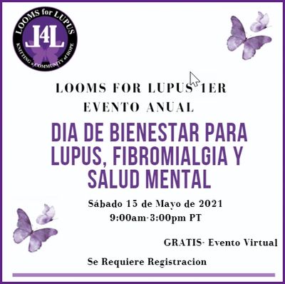 Looms for Lupus (L4L) se complace en anunciar nuestro primer Día Anual de Bienestar. Para celebrar la Concientización de Mayo sobre el Lupus, la Fibromialgia y la Salud Mental, estamos organizando un evento de día completo para la salud y el bienestar de los pacientes, cuidadores y seres queridos virtualmente debido a Covid-19. Esta es una oportunidad para compartir información educativa sobre salud, proporcionar demostraciones de prácticas saludables, crear una comunidad de apoyo y crear conciencia sobre los recursos disponibles para el bienestar.