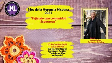 Acompañenos el Domingo 10 de Octubre de 2021 a las 12:00pm PST en vivo via la pagina de Looms4Lupus en Facebook, Twitter, y, Youtube. Continuamos la Serie "Tejiendo una Comunidad de Esperanza" dedicada a celebrar Mes de La Hispanidad cual sera transmitida en Español! Nos da mucho orgullo de tener la oportunidad de iluminar y celebrar a nuestro amigo, cantante y activista Jesus Guillen. Jesus Guillen, el cantante activista, y fundador del grupo Internacional De supervivientes del VIH. Jesus es un optimista Latino que vive con dolor cronico, ansiedad y Trastorno de estrés postraumático.