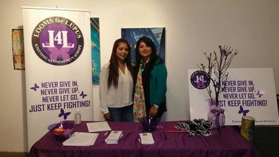 Picture: The Lupus Project, an event in Los Angeles designed to empower, educate and connect the Lupus Community. Juana and Estela (Mata Sisters) provide support and host a booth providing bilingual information for Lupus, caregivers and loved ones. Raffle Basket Donation given annually includes: Loom Knitting Kit with Yarn, Scarf loom knitted by Looms for Lupus, essential oils, lavender candle, Mandala Coloring Book, Journal, Bath Salts, Positive Affirmations and Looms for Lupus T-Shirt.