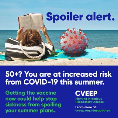 People 50 years of age and older face higher risk from COVID-19 this summer. Don’t spoil a sunny day—getting vaccinated now can help protect against severe illness. Learn more: cveep.org/stayupdated